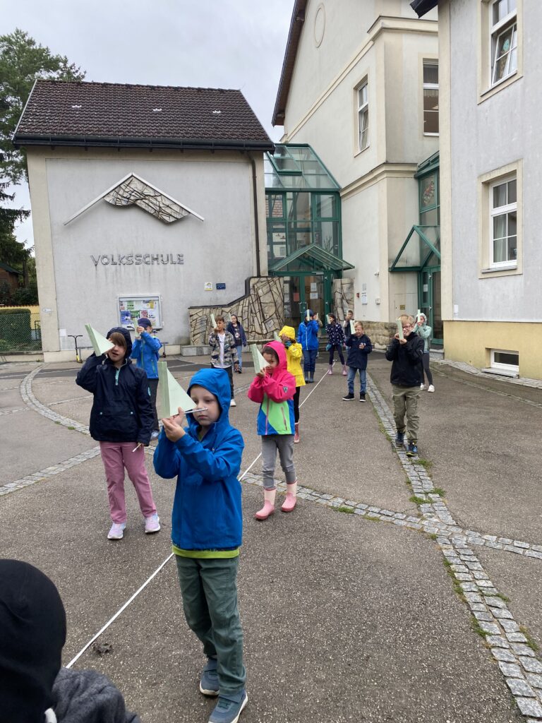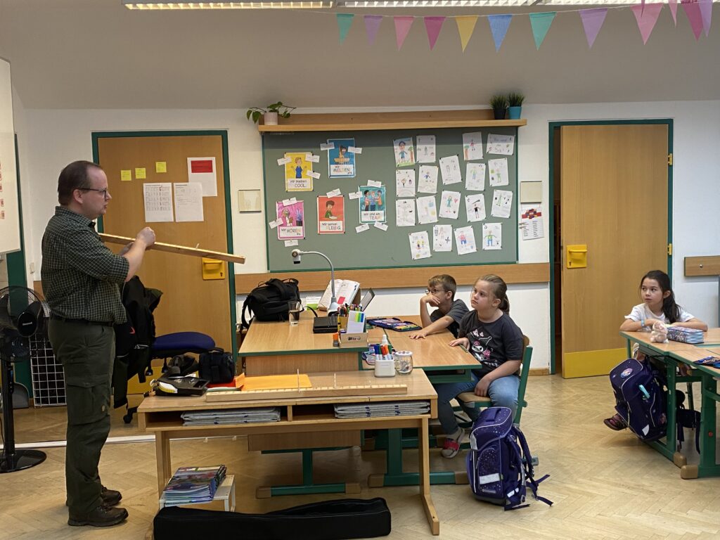 Am 16.9.2025 war Tim Ritter bei uns in den 3. Klassen. Er berichtete uns sehr viel über Bäume. Der größte Baum der Welt ist 116 Meter hoch und wächst in Kalifornien. Das ist um 1 Meter mehr als der Praterturm! Der dickste Baum der Welt bräuchte 40 Männer um ihn zu umfassen. Nach vielen interessanten Informationen haben wir ein Messgerät (Försterdreieck) gebastelt. Danach sind wir damit in den Schulhof gegangen und haben dort die Höhe des Ahorns gemessen. Danke für den tollen Workshop!