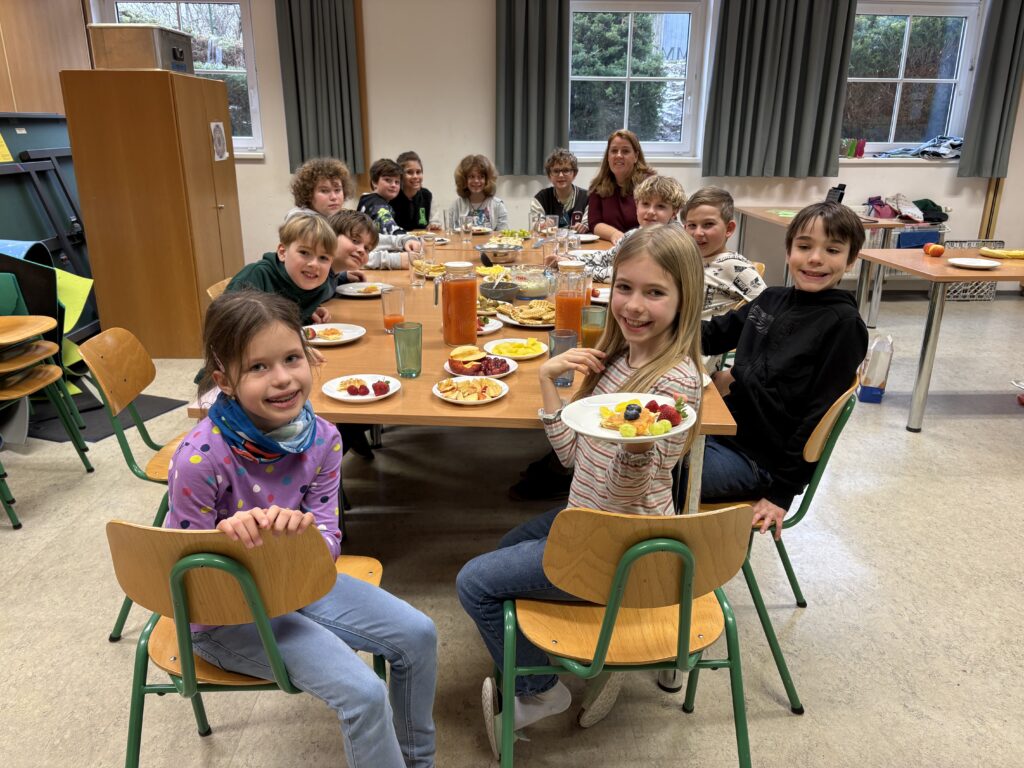 Die Kinder der 4a hatten am 17.2.2026 eine besondere Jause: Sie bereiteten unter der Anleitung ihrer Lehrerin gemeinsam eine Schuljause mit selbstgebackenen Waffeln zu. Die Mädchen und Buben rührten den Teig an und schnitten viele verschiedene Obstsorten in mundgerechte Stücke. Auch ein frisch gepresster Orangensaft und eine Bananenmilch durften nicht fehlen. Nachdem die Waffeln fertig gebacken waren, ließen sich die begeisterten Schülerinnen und Schüler die köstliche Jause gut schmecken!